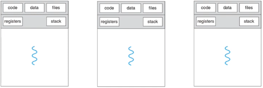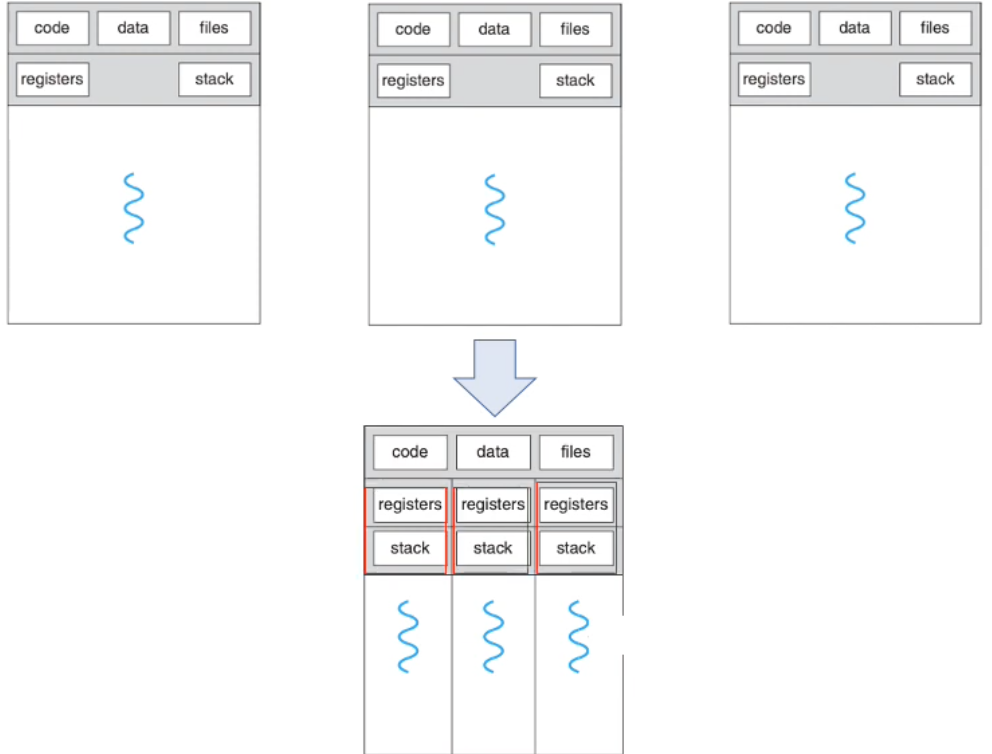 - 스레드는 한 번의 실행을 나타내는 registers와 stack을 포함하는 개념이고, 그림에서 곡선 모양이 Threads를 의미한다.