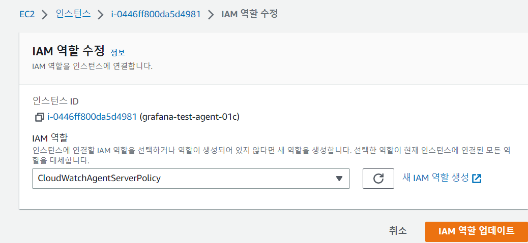 - EC2에 CloudWatchAgentServerPolicy라는 Role을 적용해놔야 함