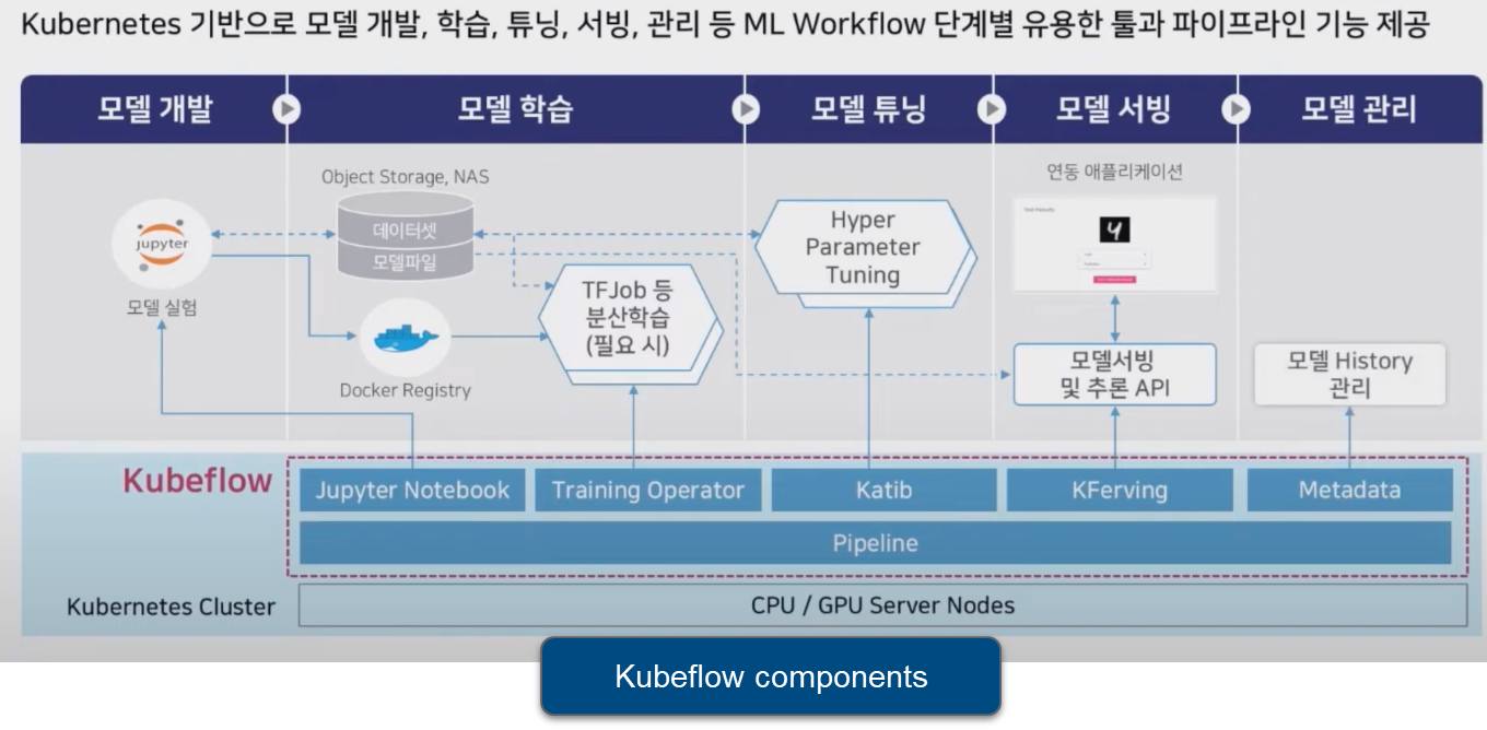 - Kubernetes 기반으로 모델 개발, 학습, 튜닝, 서빙, 등 ML Workflow 단계별 유용한 툴과 파이프 라인 기능 제공